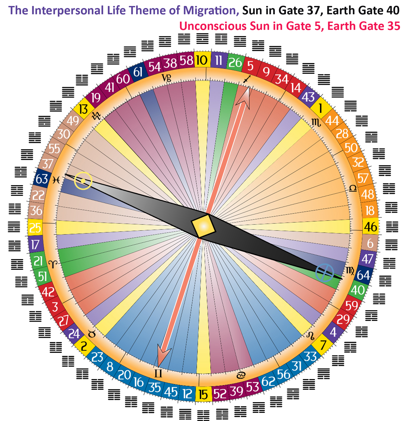 The Sun then moves into the fifth and sixth lines of Gates 37 and 40, and we find ourselves in the Interpersonal Life Theme of “Migration”. This migration happens twice a year for a couple of days each time. And this migration can be an actual physical movement of people within a civilization, or it can be a more localized, personal movement into a different company, or a different environment, or a different community. It’s an acknowledgement that you’ve done what you need to do in a specific place or community and that it’s time to move on.